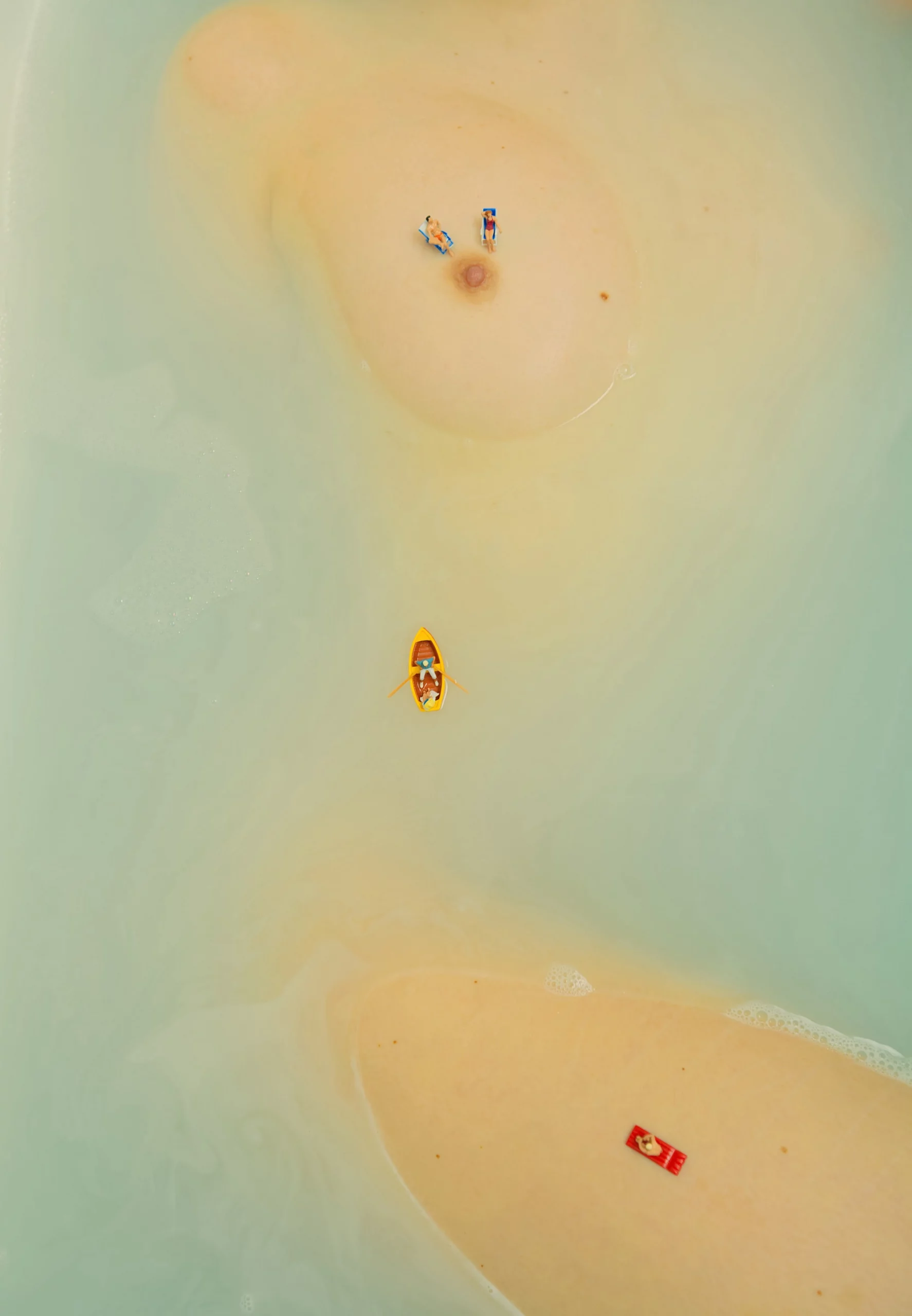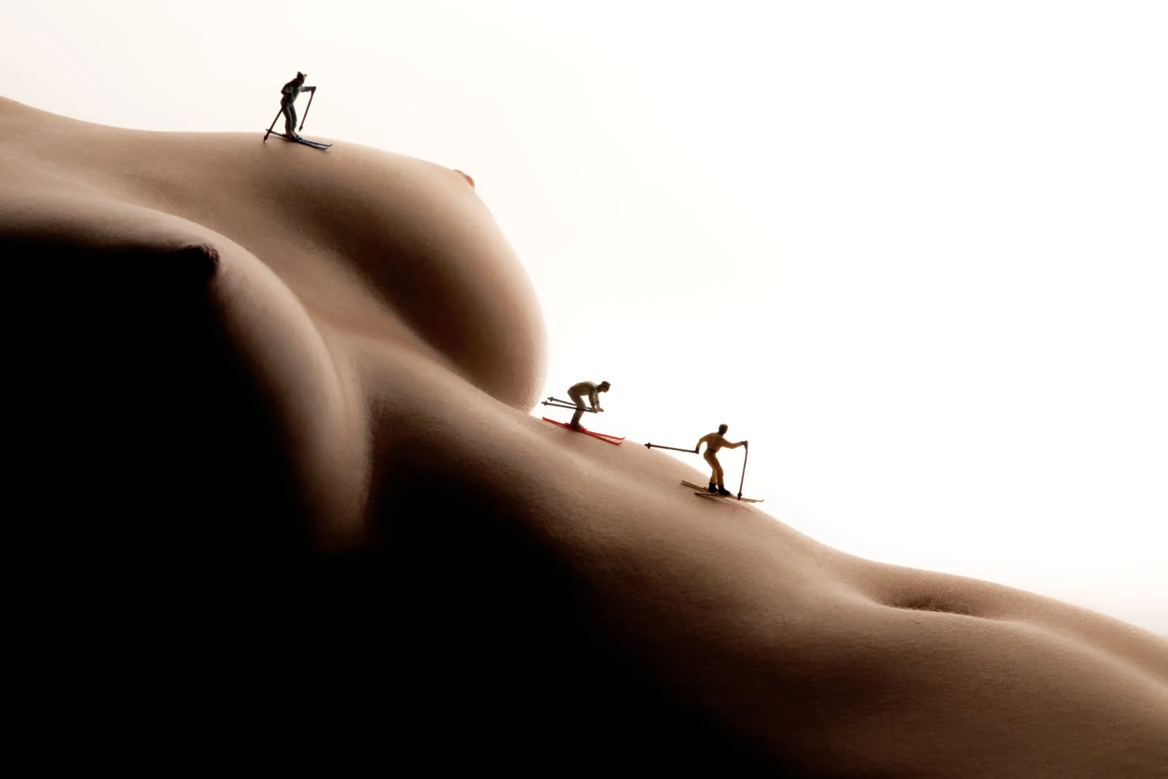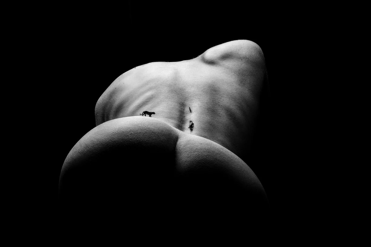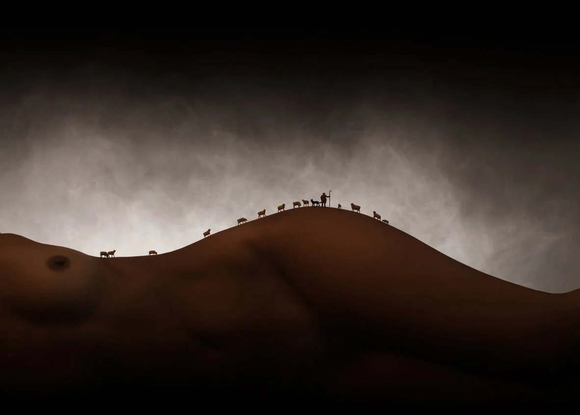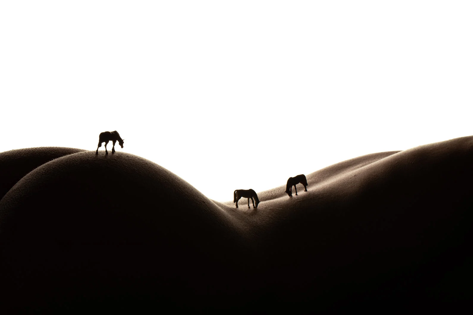 La série « Corps pour Elles » explore le concept de « bodyscape » ou corps-paysage. J. Léo utilise des parties du corps nu féminin comme support pour créer des scènes miniatures détaillées à l’aide de figurines et accessoires à l’échelle 1/87. Ces compositions, trompe-l’œil évocateurs de paysages naturels, révèlent à l’observateur leur nature illusoire et artistique. Les scènes incluent des décors variés tels qu’un désert, une oasis ou un chantier, animés par des figurines, du sable ou de la fumée. Son travail transcende toute intention érotique, privilégiant une approche esthétique et onirique. En excluant systématiquement les visages et les retouches numériques, l’artiste met en valeur la pureté et la plasticité du corps, transformé en médium artistique. Chaque photographie résulte d’une préparation minutieuse, où la mise en scène se fait directement sur le modèle, sans artifice électronique. J. Léo s’inscrit ainsi dans une démarche mêlant précision technique et créativité imaginative, invitant le spectateur à un voyage visuel fascinant où l’art et l’imaginaire se rencontrent.