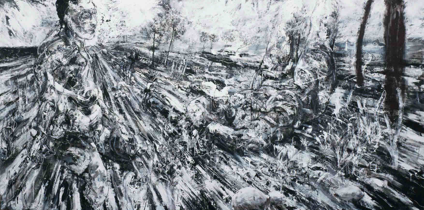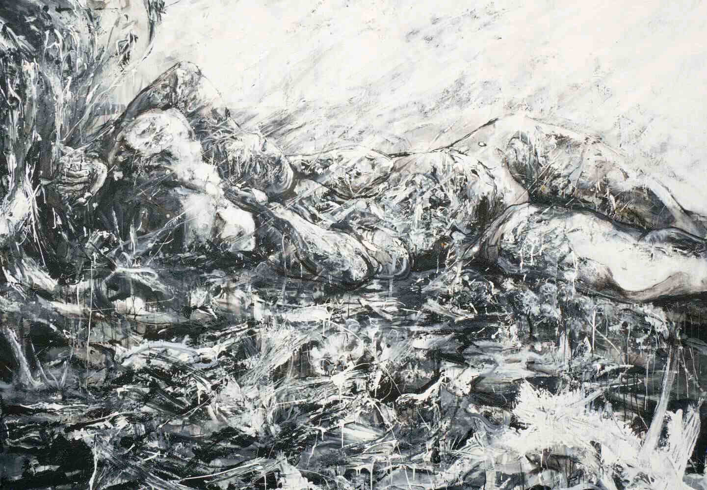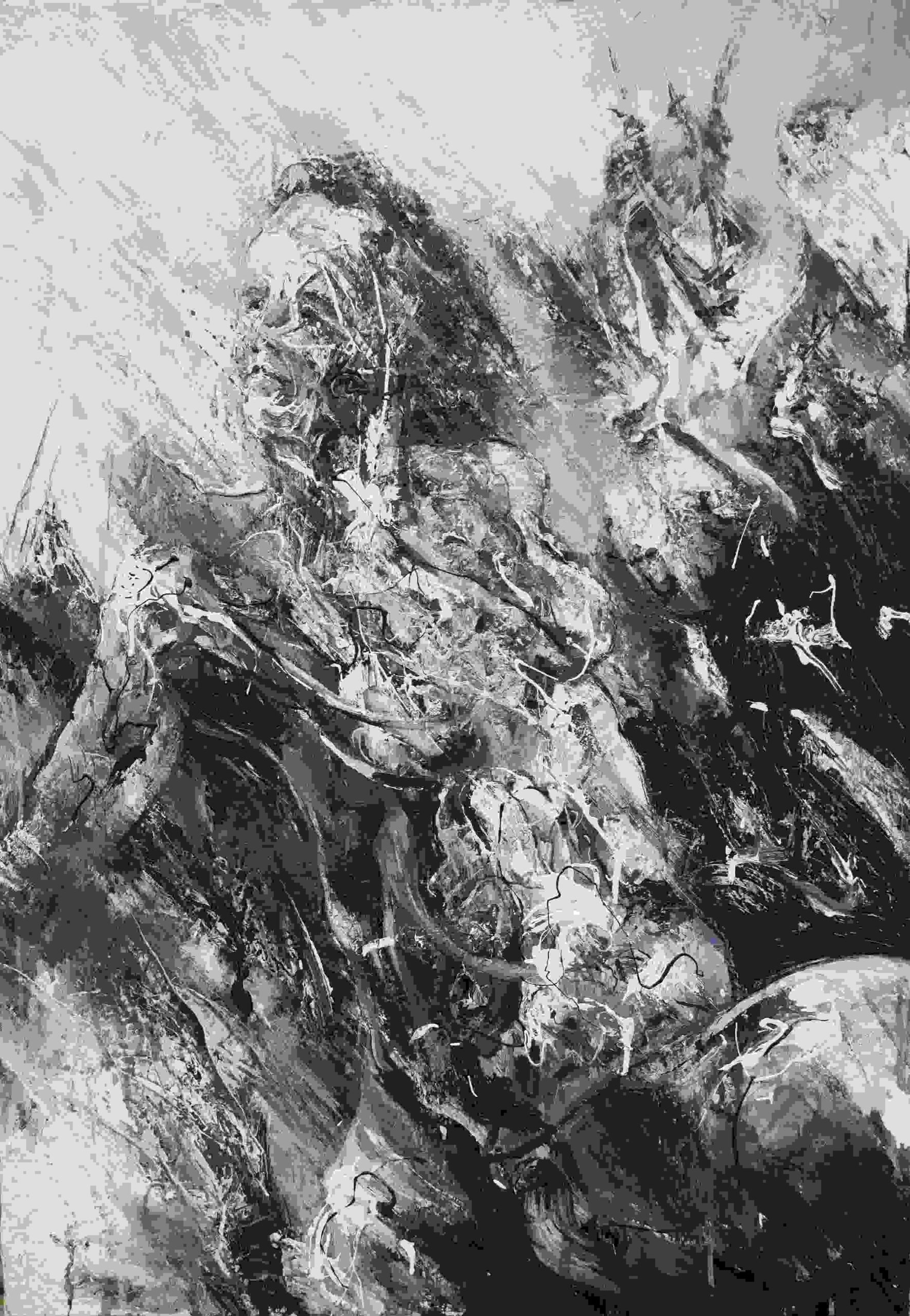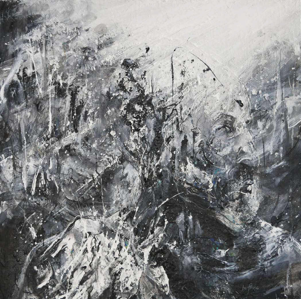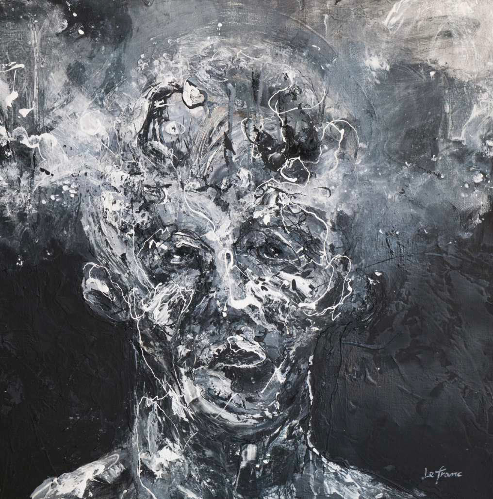 Théo Le Franc utilise des huiles, des acryliques et des techniques mixtes en monochrome, ou bichromie, pour capturer la forme humaine et les matières organiques. Chaque pièce pose des questions sur l’importance du corps humain, sa fragilité et sa relation avec notre environnement.
